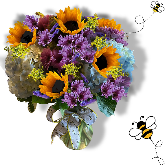 This arrangement is a perfect choice to send some birthday wishes or really for any occasion! Smart as can be a lovely bouquet designed in a clear glass vase filled with hydrangea, sunflowers, chrysanthemums, solidago, and statice, along with salal and variegated pittosporum greenery, and then completed with an adorable French ribbon. Please note that some substitutions may need to be implemented, but we will do our best to come as close as possible to the picture as shown.