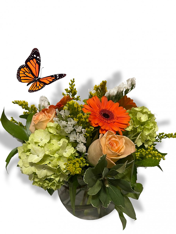If you're looking for something out of the ordinary, look no further—this is the perfect arrangement you've been looking for! Beautifully arranged in a clear glass bubble bowl with green mini hydrangeas, stunning gerbera daisies, solidago, statice, roses, variegated pittosporum, and salal greenery. Please keep in mind that some flowers may not be available, but we will do our best to come as close as possible to the picture shown*