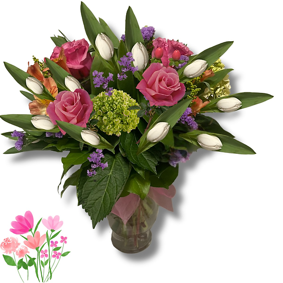 Celebrate the season of renewal with a fresh and joyful floral arrangement that features a soft blend of springtime favorites. Delicate tulips gently arch with grace, bringing a sense of movement and elegance, while lush hydrangeas form a cloud-like base, offering fullness and texture. Nestled among them are beautiful pink roses. Adding contrast and depth, purple statice brings rich color and a touch of wildflower charm, perfectly complementing the serene palette. Alstroemeria, also known as Peruvian lilies, add intricate detail with their speckled petals and long-lasting blooms, filling the arrangement with cheer and longevity. A clear glass vase thoughtfully holds all the flowers, showcasing the natural beauty of each bloom. It’s a perfect gift for a Passover Seder or Easter brunch—radiating warmth, tradition, and the promise of spring. Please note that we may substitute some flowers if they are out of stock. We will strive to match the picture as closely as possible.